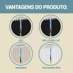A Cortina Blackout Preto é ideal para quem busca um ambiente mais escuro, privado e confortável. Feita de PVC, tem tamanho de 280cm x 280cm e é indicada para varões de até 2 metros. Além de bloquear a claridade excessiva, oferece conforto térmico, visual e reduz a entrada de vento, proporcionando um espaço mais aconchegante e elegante.