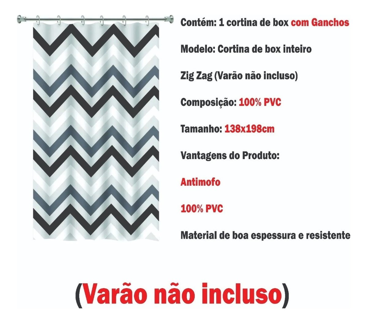 Dê um toque de estilo ao seu banheiro com a Cortina de Box Zig Zag em Preto e Branco. Feita de material PVC de boa espessura e resistente, esta cortina é impermeável, protegendo a área do banho e evitando respingos no restante do banheiro. Com uma estampa moderna em zig zag e ilhós reforçado para fácil instalação, ela combina estilo e praticidade para seu ambiente. (*Varão não incluso)