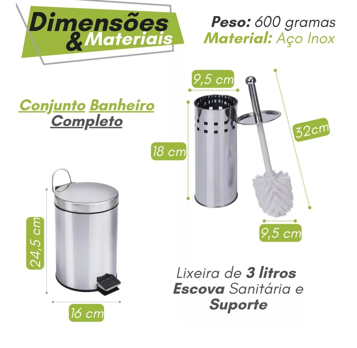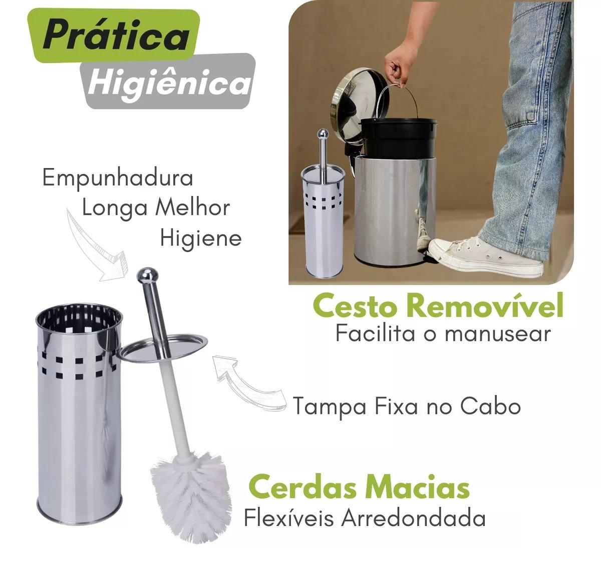 Combinação perfeita de praticidade, higiene e sofisticação, este conjunto é ideal para quem busca organização e estilo no banheiro. Fabricado em aço inoxidável de alta qualidade, é resistente à corrosão e ao desgaste, garantindo durabilidade e beleza por muito mais tempo. A lixeira conta com um pedal para facilitar a abertura, evitando o contato direto com as mãos, além de um balde interno removível que torna a limpeza ainda mais prática. O suporte para escova sanitária também é de aço inox, resistente à umidade e fácil de limpar, mantendo o banheiro organizado e higienizado.