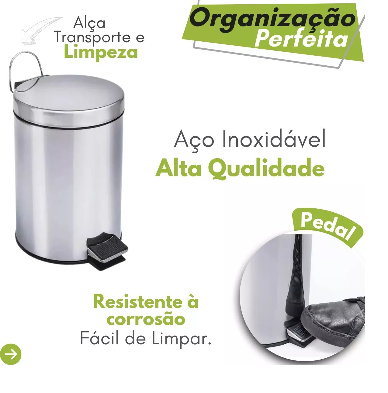 -Praticidade: Pedal que facilita a abertura da lixeira e balde interno removível.
