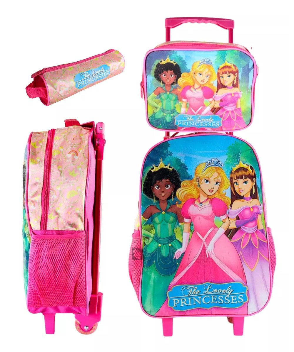 Kit Mochila de Rodinhas Princesas com 3 Peças – Mochila, Lancheira Térmica e Estojo Rosa